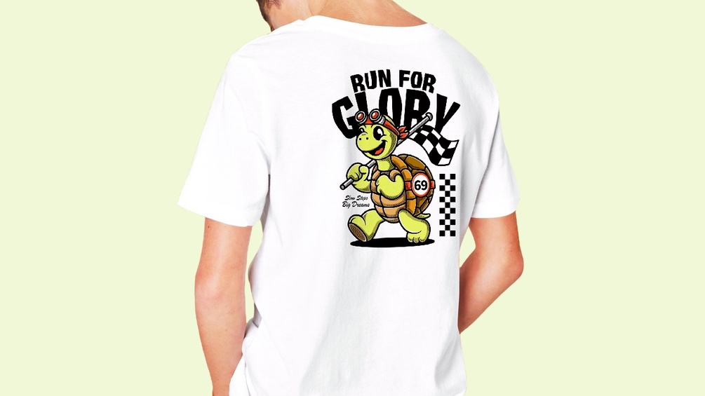 'Run For Glory' design features a determined cartoon turtle proudly carrying a race flag, symbolizing perseverance and the pursuit of victory. Set against a backdrop of bold, vibrant colors, this design conveys energy, optimism, and unwavering resolve. The turtle, a timeless symbol of patience and resilience, exemplifies the idea that success is not solely about speed, but about steadfast determination. This design is ideal for those who embrace the journey toward achievement with tenacity, making it a perfect fit for high-impact branding, merchandise, and collections.