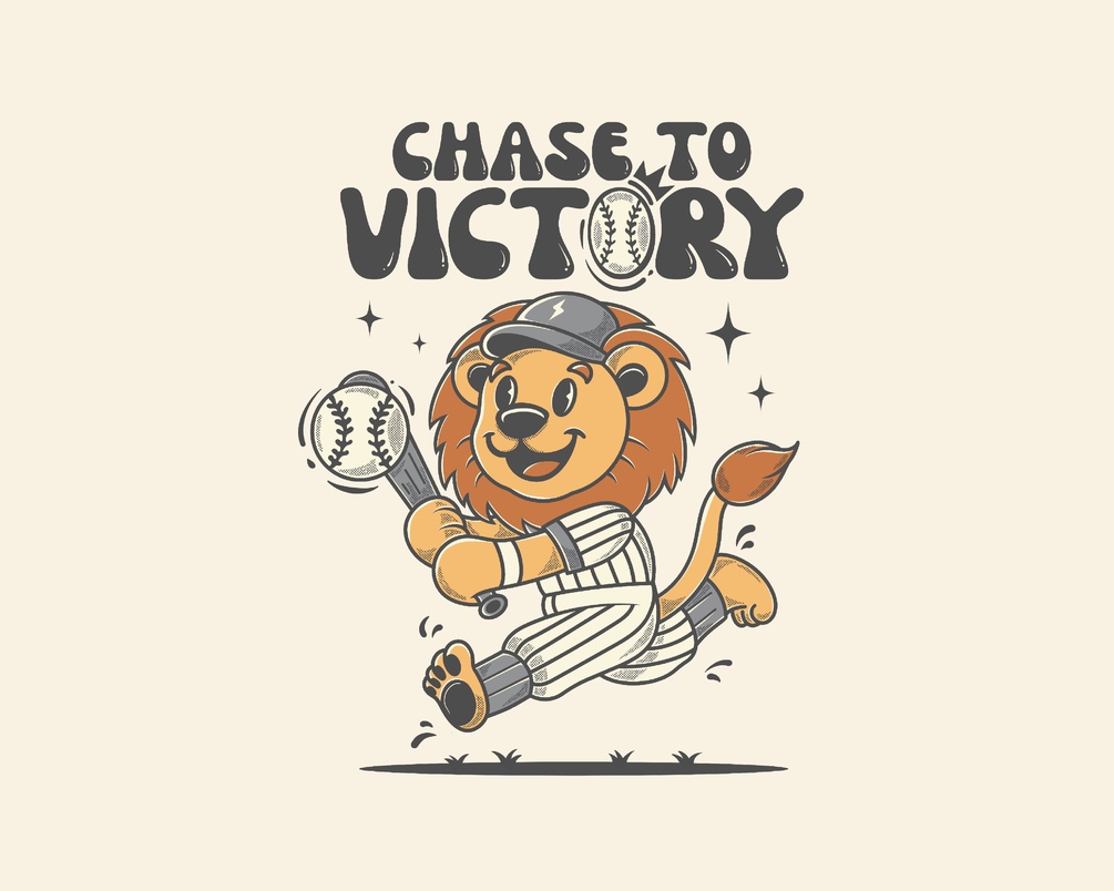 The 'Chase to Victory' design features a fierce and determined lion mascot, embodying the spirit of competition and triumph. With its retro-inspired color palette, the design combines vintage charm with dynamic energy, making it a perfect blend of nostalgia and modern appeal. The powerful lion, symbolizing strength and perseverance, is ready to dominate the baseball field, motivating everyone to push forward and achieve victory. This design is ideal for those who strive for greatness and embrace the thrill of the chase.